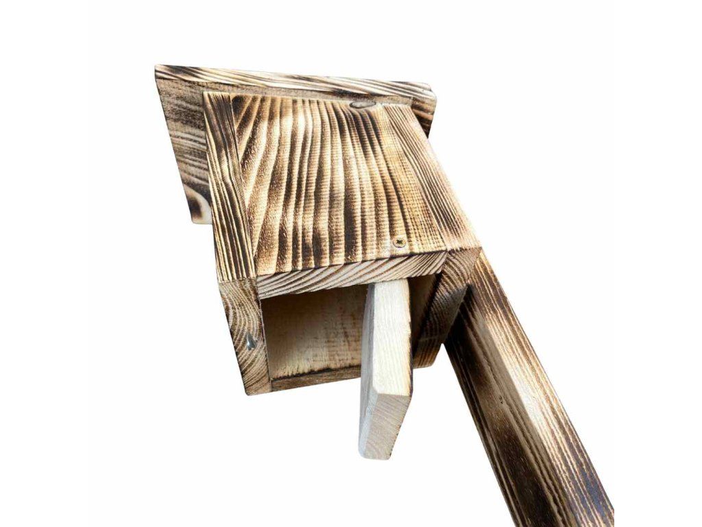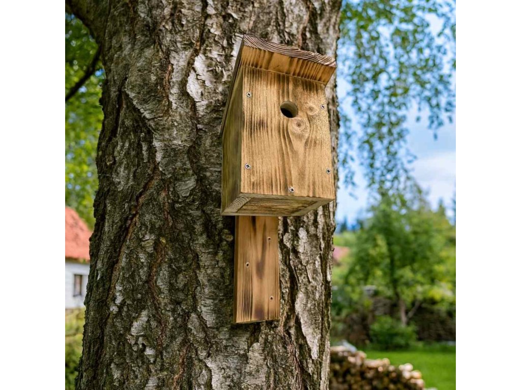Budka je vyrobena z masivního smrkového dřeva s opalovaným, nehoblovaným povrchem, který jí dodává přírodní vzhled a zároveň zvyšuje odolnost vůči povětrnostním vlivům. Každý kus je originál, ručně zpracovaný tak, aby dobře sloužil a vydržel dlouhá léta. Díky zadní montážní liště ji snadno a pevně připevníte na strom nebo sloupek — ideálně do klidnější části zahrady, kde budou mít ptáci dostatek soukromí.