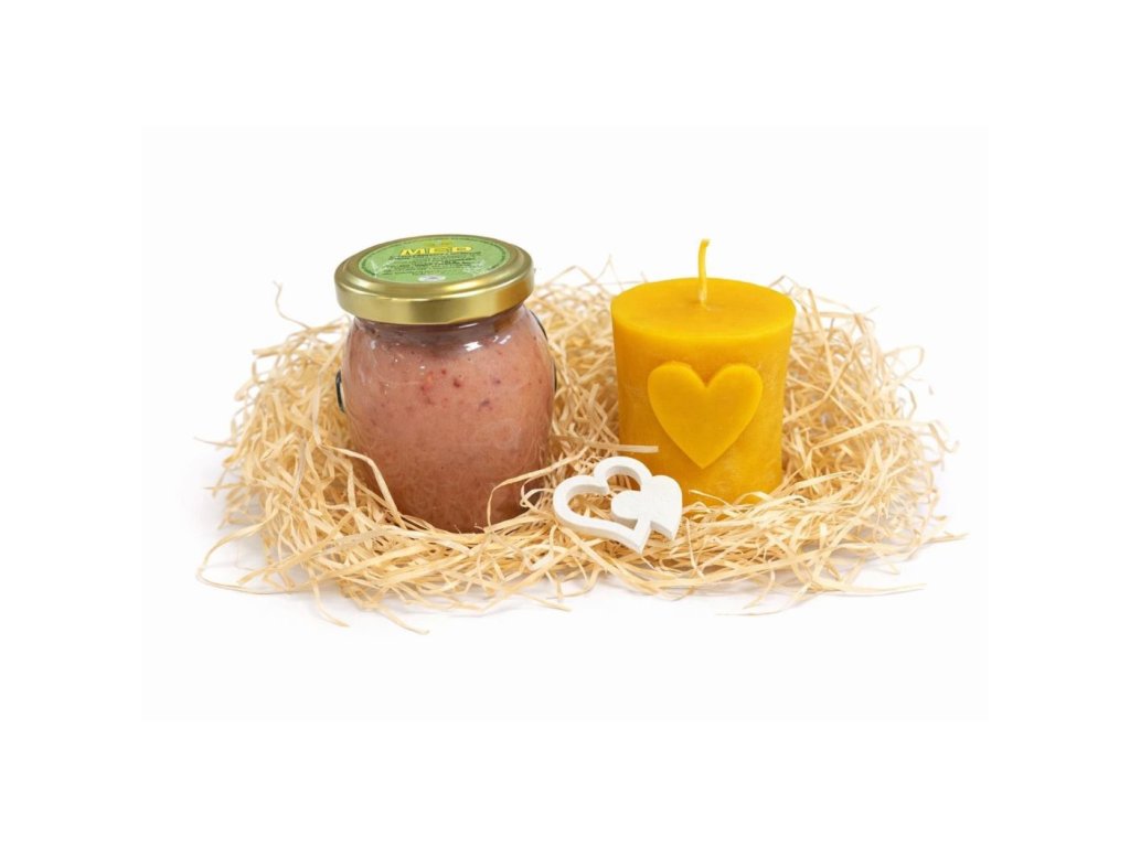 Druhou částí balíčku je svíčka ze 100% včelího vosku ve tvaru válce se srdíčkem. Včelí vosk je jeden z nejčistších přírodních materiálů — při hoření neuvolňuje toxiny, jemně čistí vzduch a vytváří teplé, uklidňující světlo. Srdíčko na svíčce symbolizuje péči a pozornost, kterou chcete předat dál.