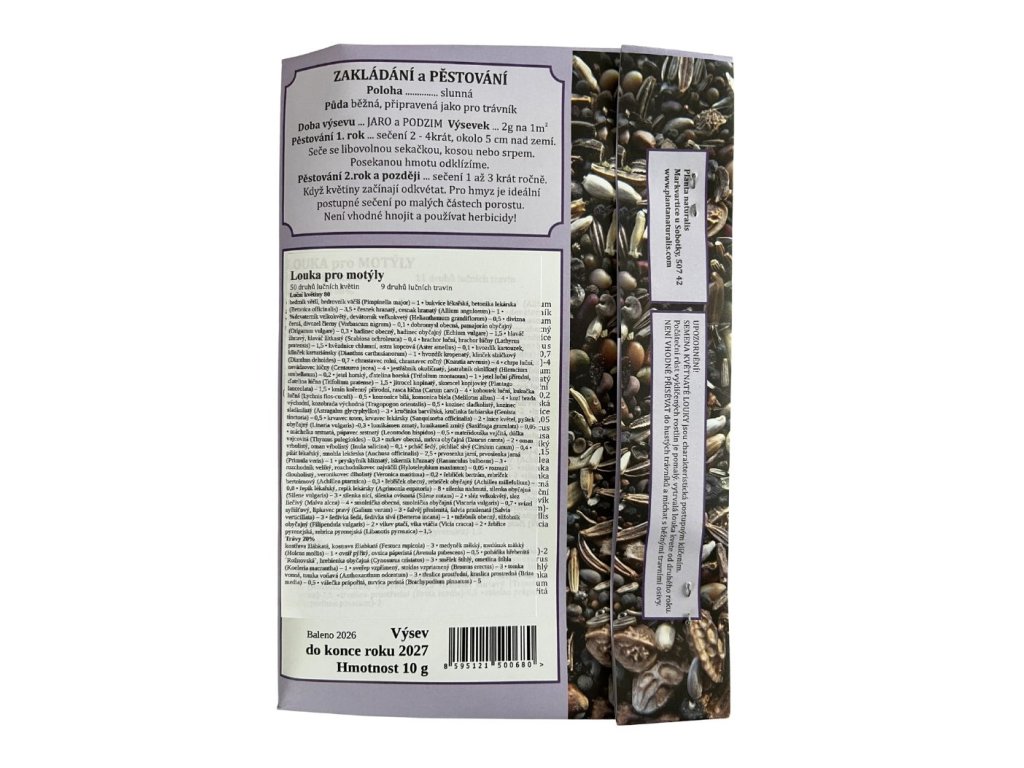 Směs Louka pro motýly je postavená na bohatém základu – obsahuje 51 druhů lučních květin doplněných o 11 druhů trav, které společně vytvářejí pestrý a stabilní porost. Aby mohla louka skutečně sloužit motýlům ve všech fázích jejich života, je důležité myslet nejen na potravu pro dospělce, ale i na potřeby housenek. Květnatá louka prospívá nejlépe tehdy, když se část porostu ponechá přes sezónu neposečená. Jeden rok zůstane určitý úsek stát od konce července až do dalšího léta, zatímco sousední část sečete běžným způsobem. Následující rok se role vymění. Tento jednoduchý postup pomáhá udržet pestrost rostlin, umožňuje hmyzu dokončit vývoj a poskytuje mu bezpečné místo k přezimování.