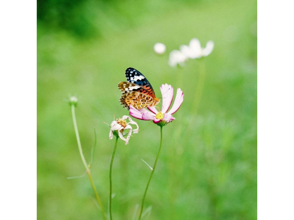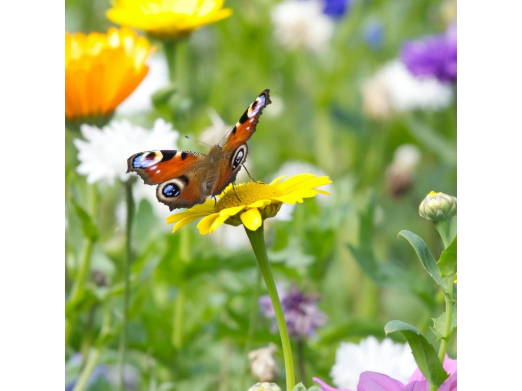 Složení směsi vychází z tradičních druhů českých polí a luk. Najdete v ní například měsíček, chrpu, krásenku, pohanku, lničku, svazenku a další rostliny, které jsou známé svou medonosností, rychlým růstem a schopností vytvářet pestrý květnatý porost během krátké doby. Každý druh má v této směsi své místo — některé poskytují nektar dospělým motýlům, jiné slouží jako potrava pro housenky, další přinášejí výrazné barvy, které motýly přirozeně přitahují. Výsledkem je harmonická směs, která funguje nejen esteticky, ale i ekologicky.