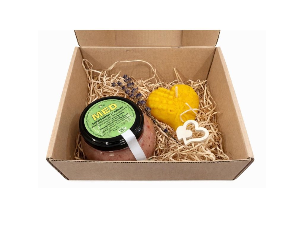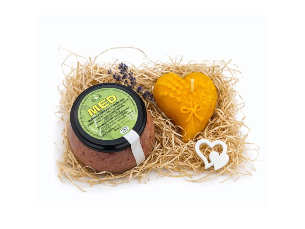 Tento dárkový balíček vznikl jako pocta upřímné lásce a radosti z maličkostí, které dokážou zpříjemnit každý den. Spojuje v sobě dva produkty, které nesou otisk naší rodinné práce – malinový med plný ovocné svěžesti a ručně odlitou svíčku ze včelího vosku ve tvaru srdce. Každý kus vzniká v malých šaržích, s důrazem na kvalitu a poctivost, které jsou pro naše včelařství typické.