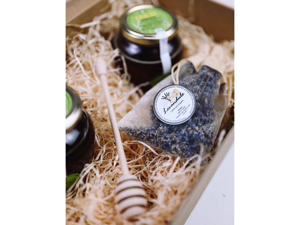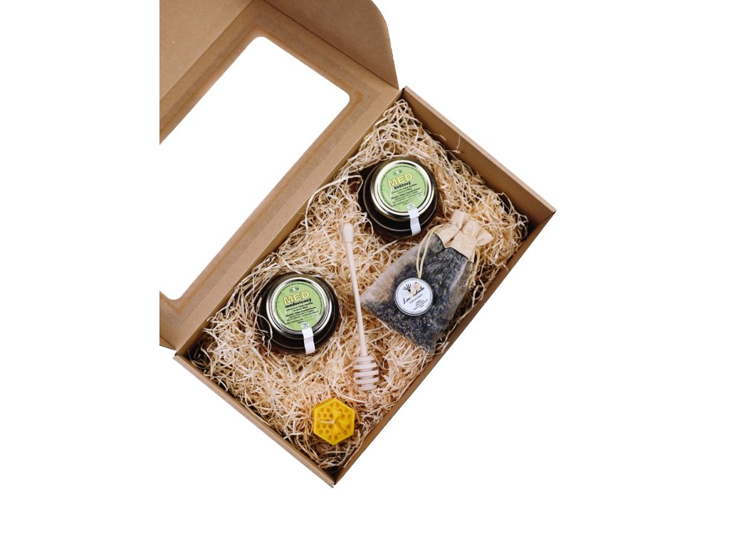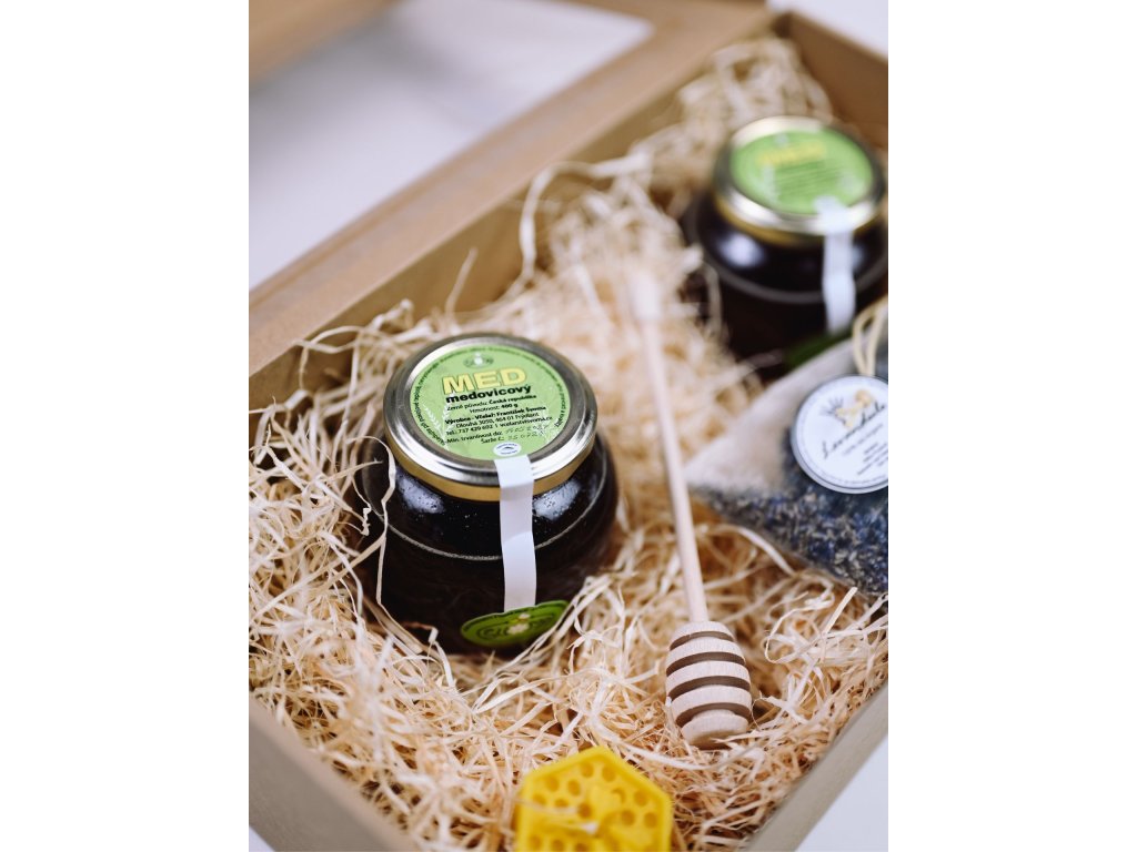 Každý kousek v tomto balíčku má svůj původ v české krajině — květový i medovicový med z Jizerských hor, ručně vyráběná svíčka, medovka z české dílny i voňavá levandule. Pečlivě vybrané složky tvoří dárek, který má duši a mluví jazykem vděčnosti.